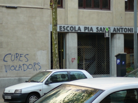 Una contundent acusació al costat de la porta principal de l’escola Pia. No l’havien treta per què era molt recent? Per què si la treien els hi tornava a aparèixer com si fossin taques miraculoses? O bé per què tard o d’hora la veritat surt a la llum i accepten la pintada com una resignada penitència de llurs pecats?