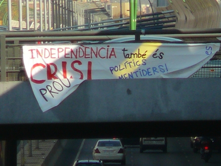 Aquest matí circulava amb el tramvia per la Gran Via i a les onze del matí he vist una pancarta que penjava del pont de Bac de Roda sobre la Gran Via. Paraules clau: Independència, Crisi i Referèndum. No he pogut fixar-m’hi més. La pancarta estava encarada en sentit Maresme, on un grapat de municipis faran aquest diumenge 13 de desembre la consulta sobre la independència.
