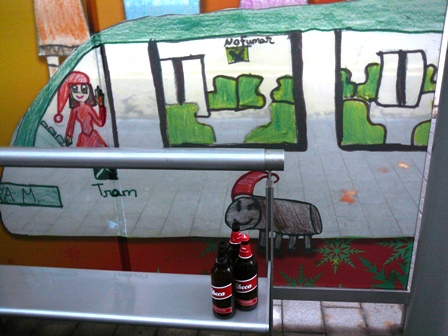 El tió també és present en el guarniment d’algunes parades del tramvia. Com aquesta de Ciutadella|Vila Olímpica, on ahir al matí el vaig enxampar infraganti tornant de festa pimplant-se tres xibeques per oblidar les tonyinades que havia de patir hores més tard… Quin exemple per a la canalla!