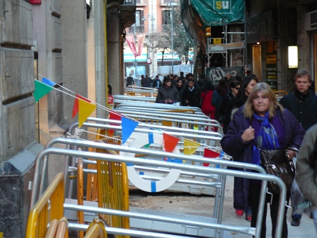Al carrer de la Canuda han de patir, a més, les obres de substitució del paviment de llambordes de marbre per d’altres de més grosses; però igual de neutres. Davant d’un panorama tan gris ―de dies rúfols i llambordes tristes―, aquesta botiga ha decidit posar una mica de color per embarcar els potencials clients i salvar-los del monocromatisme actual.