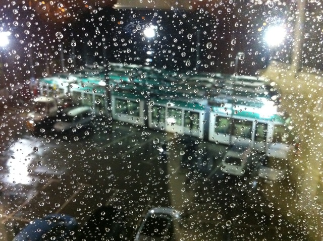 Des de la meva talaia veia com els tramvies tenien doble sessió de rentat. La pluja els remullava per fora mentre a dins es veia feinejar el personal de neteja. Si els caps de setmana ja disposen de menys temps per enllestir, el servei acaba dues hores més tard però comença igual de d’hora, aquella nit calia afegir-hi la pluja. Amb la humitat fóra un miracle si s’assecava tot abans no arribessin els primers conductors per preparar les unitats.